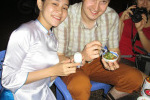Na wieczór zostawiliśmy sobie wisienkę na torcie. Wycieczkę „z jedzeniem” organizowaną przez XO Tours. Trochę kosztuje ($72), ale nie żałuję ani jednego centa. Pomysł na wycieczkę jest taki: siadamy, jako pasażer skutera i zasuwamy przez pół miasta, zatrzymując się na jedzenie. Kierowcami w tej firmie są tylko kobiety, ubrane w tradycyjny strój (Ao Dai), z bardzo dobrym angielskim, będące też naszym osobistym przewodnikiem. Mamy okazję zobaczyć spory kawałek miasta, przejeżdżając przez bogatsze i biedniejsze części, a także przez targ w Chinatown. Na jedzenie zatrzymujemy się w trzech miejscach, zaczynając od zupy (jakiejś ze środkowego Wietnamu – nie Pho), a potem między innymi krewetki, żaby (całe, nie tylko udka), mięso kozy, kałamarnice, przegrzebki (pycha!), małże, kraby. Nie przepadam szczególnie za owocami morza, ale tutaj bardzo mi smakowało. Wszystko z nieograniczoną ilością piwa, w towarzystwie kilkunastu innych turystów. A na koniec dla odważnych możliwość zjedzenia balut. Byłem tak pozytywnie nastawiony, że skosztowałbym wtedy wszystkiego, co mi podają. Dostałem akurat taką „lajtową” wersję, już obraną ze skorupki i w jakimś dobrym sosie. Smakuje jak… hmmm.. jajko z mięsem. Całkiem dobre. Rozkrajałem jajko łyżeczką, ale na szczęście nie trafiłem na jakiś ciężki widok, na przykład głowy i dzioba kaczki