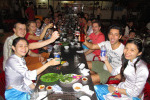Na jedzenie zatrzymujemy się w trzech miejscach, zaczynając od zupy (jakiejś ze środkowego Wietnamu – nie Pho), a potem między innymi krewetki, żaby (całe, nie tylko udka), mięso kozy, kałamarnice, przegrzebki (pycha!), małże, kraby. Nie przepadam szczególnie za owocami morza, ale tutaj bardzo mi smakowało. Wszystko z nieograniczoną ilością piwa, w towarzystwie kilkunastu innych turystów. A na koniec dla odważnych możliwość zjedzenia balut. Byłem tak pozytywnie nastawiony, że skosztowałbym wtedy wszystkiego, co mi podają. Dostałem akurat taką „lajtową” wersję, już obraną ze skorupki i w jakimś dobrym sosie. Smakuje jak… hmmm.. jajko z mięsem. Całkiem dobre. Rozkrajałem jajko łyżeczką, ale na szczęście nie trafiłem na jakiś ciężki widok, na przykład głowy i dzioba kaczki ;)